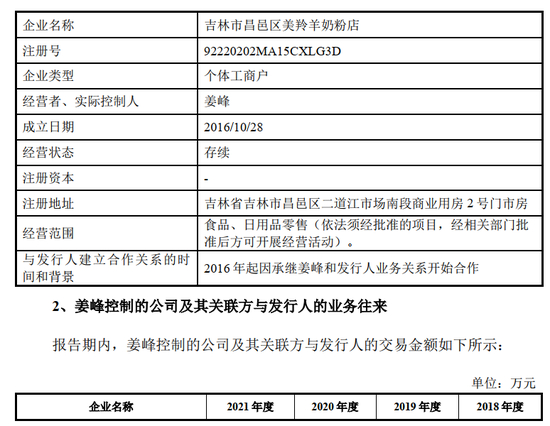 姜峰系吉林市昌邑区美羚羊奶粉店实际控制人, 2015年姜峰以个人名义与发行人合作,后于2016年10月设立吉林市昌邑区美羚羊奶粉店继续与发行人合作, 吉林市昌邑区美羚羊奶粉店的基本情况如下: