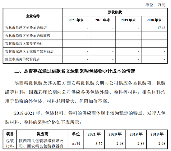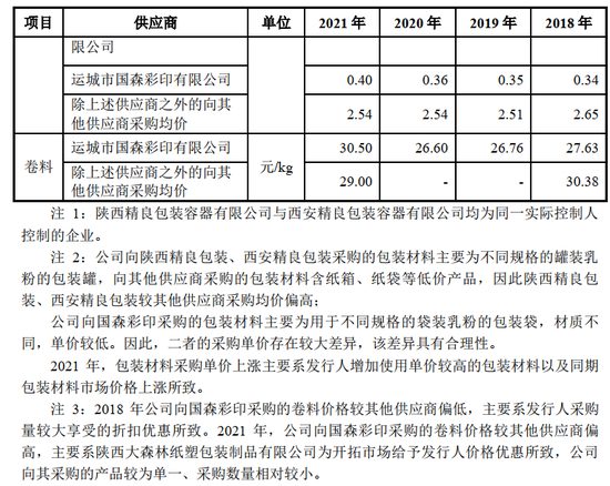 2018-2021 年,公司向陕西精良包装、国森彩印采购价格稳定, 2018 年未出现明显差异。相关材料市场价格比较透明, 通过对比市场价格以及实地走访精良包装、国森彩印现场考察其供应发行人与供应其他客户的同类产品价格,两家供应商供应的材料价格公允, 不存在通过借款名义达到采购包装物少计成本的情形。