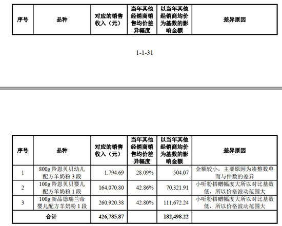 上述单品中差异程度超过 20%的主要包括 800g 羚恩贝贝幼儿配方羊奶粉 3段以及小听粉等个别单品,价格差异幅度较大的原因具体为: