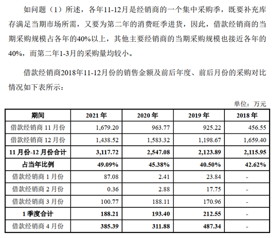 如上表可见, 其他主要经销商年底11-12月采购比例均保持在全年接近40%, 比例较高,与借款经销商水平相当, 无明显差异。主要经销商从自身利益出发, 时点化、规模化进货是历年普遍情况, 并非某一年特有,也并非借款的部分经销商所特有。2021年比例有所降低主要原因是, 2021年12月当月开始、春节前结束的西安及周边疫情影响了部分经销商的月末物流发货。