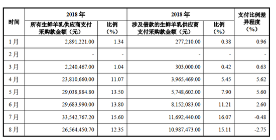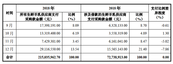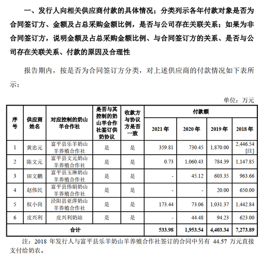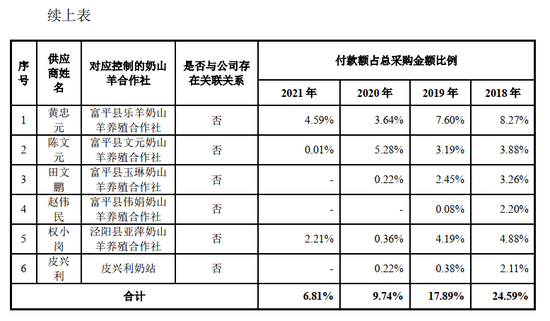 2018-2021 年,公司存在向专业合作社采购生鲜羊乳的情况, 2018 年度、2019 年度、 2020 年度、 2021 年度通过专业合作社采购生鲜羊乳金额分别占该年度全部原料奶采购金额的 42.31%、 40.58%、 22.69%、 22.98%。上述供应商均为公司报告期内合作的专业合作社,公司向上述供应商付款属于正常的奶款支付行为,具有正常的商业逻辑。