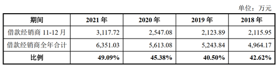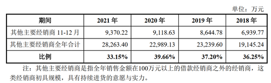 如上表可见, 借款经销商年底11月-12月销售合计金额保持稳定,比例均保 持在全年40%以上, 并不存在2018年比例较高、 2019年-2020年比例较低的情况。