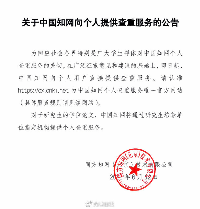 6月12日零点,同方知网(北京)技术有限公司发布《公告》:即日起,中国知网向个人用户直接提供查重服务。请认准 https://cx.cnki.net 为中国知网个人查重服务唯一官方网站(具体服务规则请见该网站)。