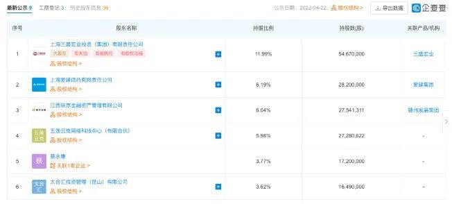 据企查查数据显示,截至2022年4月22日,中昌数据前四大股东为三盛宏业、爱建信托、江西瑞京、五莲云克四大公司。