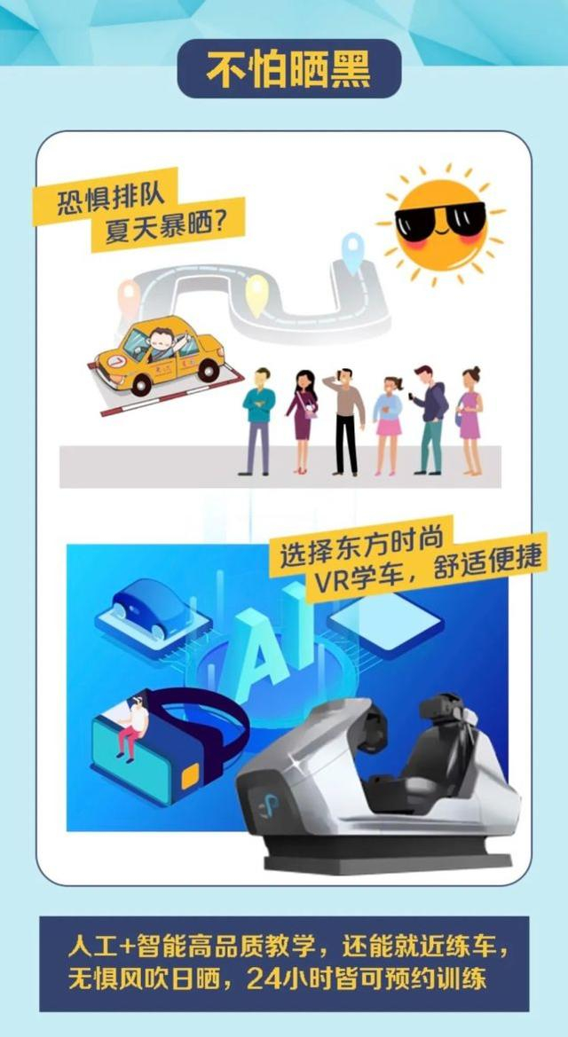 打动年轻学员的,除了一流的软硬件,引领潮流的“VR智教”更是锦上添花的存在,坐在VR智能驾驶培训模拟器里,戴上头显,跟坐在真车里一样,科目二的考试项目在VR智能驾驶培训模拟器上都能训练,换挡、加速、刹车、转弯,这些功能跟实际驾车没有区别,还更加安全。而且VR智能驾驶培训模拟器还可以让学员掌握应对复杂路况、恶劣天气等突发状况下的操作技能,这些极限情况下的特殊练习,都是实车训练难以做到的。而且空调房里进行VR训练,夏天不再怕晒黑。目前,东方时尚在北京市各主要商圈、高校附近有20家营业部可以为学员提供VR训练,学员可以最大化利用碎片时间,就近练车。