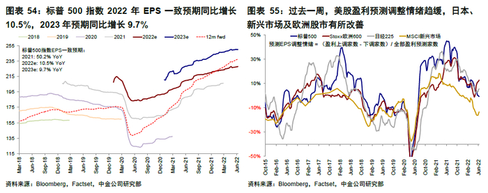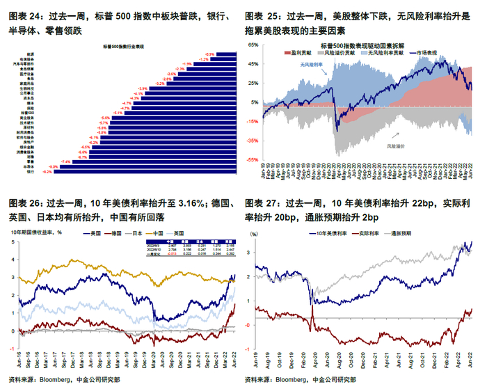 周初亚马逊等科技股上涨带动美股连续两日收高,但后半周欧央行偏鹰表态、对通胀和紧缩的担忧引发欧美股市下跌。欧央行在6月会议宣布将于7月1日起终止资产购买计划,并计划于7月加息25bp,若后续通胀预测未能回落或进一步恶化,9月或将提高加息幅度。周五美国5月CPI数据再创新高,使市场期待的缓和落空,美联储紧缩预期升温,受此影响,10年美债利率抬升22bp至3.16%(以实际利率为主20bp),美股尤其是成长风格承压。