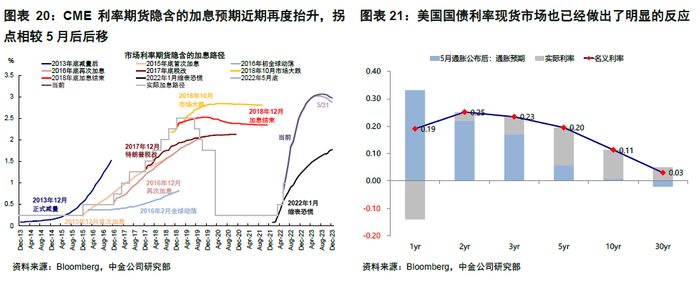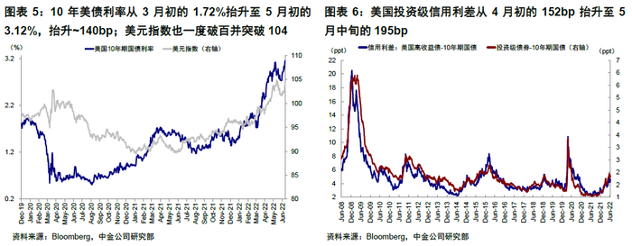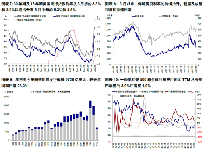 如第一部分分析,近期金融条件的收紧已经开始体现在一些二级市场指标上,尽管美联储的实际操作还不算多。例如,3~4月美债利率和美元的急升(10年美债利率从3月初的1.72%抬升至5月初的3.2%附近,抬升~140bp;美元指数也一度破百并突破104)、4~5月信用利差的走阔以及年初至今信用债发行规模的降低(美国投资级信用利差从4月初的152bp抬升至5月中旬的195bp,超过2018年末并仅次于2015年末;年初至今美国信用债发行规模6726亿美元,较去年同期回落23.3%)、房贷利率的抬升及房屋销售的降温(30年期及15年期美国抵押贷款利率从3月初的3.8%和3.0%快速抬升至5月中旬的5.3%和4.5%;3月及4月新屋及成屋销售快速回落,新屋成交从2月末的79万套回落至4月末的59万套、成屋销售从2月末的59万套回落至4月末的56万套)便是预期引导的金融条件收紧的体现。
