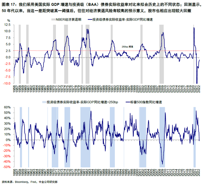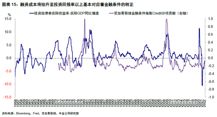 基于这一理论,我们采用美国实际GDP增速近似代替自然利率、用投资级(BAA)债券实际收益率近似大体市场利率。就历史经验来看,投资级债券实际收益率-美国实际GDP增速转正(即融资成本超过投资回报率)基本对应芝加哥联储金融条件(信用分项)的转正。
