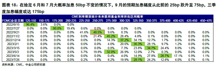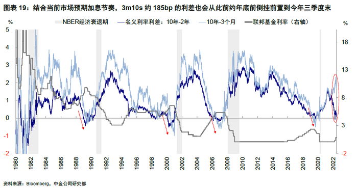 但值得注意的是,5月大超预期的通胀数据再度抬升了市场对后续美联储的加息节奏。在给定6月和7月大概率加息50bp不变的情况下,9月预期加息幅度从此前的25bp跃升至75bp,三季度加息幅度或达175bp,那么当前3m10s约185bp的利差也会从此前约年底前倒挂前置到今年三季度末。