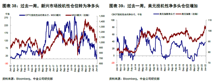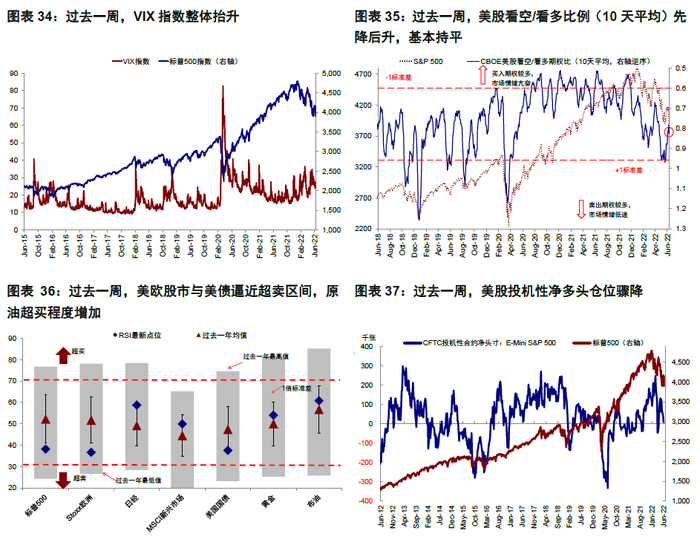过去一周,VIX指数整体抬升,美股看空/看多比例(10天平均)先降后升,基本持平。美欧股市和美债逼近超卖区间。仓位方面,美股投机性净多头仓位骤降,新兴市场投机性仓位转为净多头,铜期货投机性净空头仓位减少,长短端美债净空头仓位均增加。