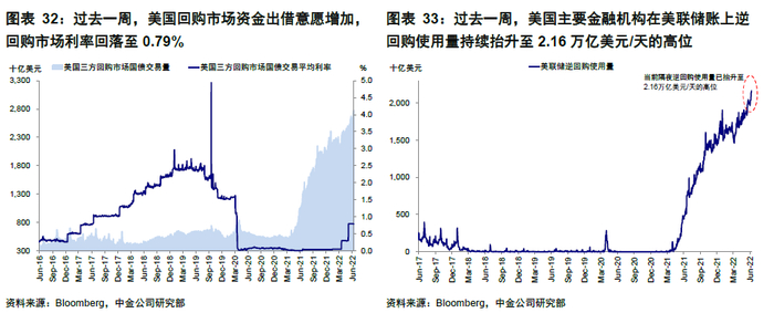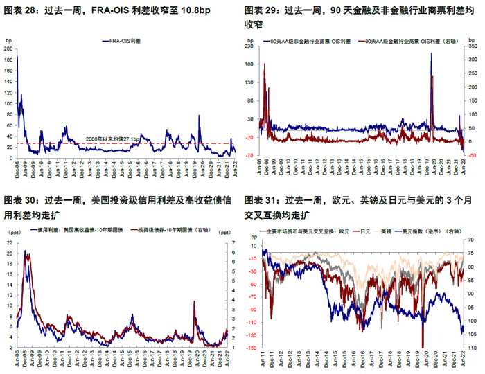 过去一周,FRA-OIS利差收窄至10.8bp,90天金融及非金融行业商票利差均回落。不过信用利差均扩大,同时欧元、英镑及日元与美元3个月交叉互换也走扩。此外,美国主要金融机构在美联储账上逆回购使用量持续抬升至2.16万亿美元/天的高位,创历史新高。