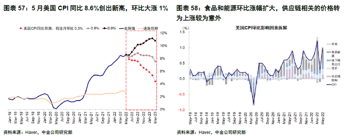 5月通胀再超预期,拐点未能兑现。5月美国CPI同比8.6%创出新高,高于前值和预期(8.3%、8.2%);环比大涨1%,大幅超过上个月的0.3%和预期的0.7%。核心CPI同比降至6%(上月6.2%);环比0.6%,与上个月持平,但也高于预期。此次通胀数据各主要贡献分项都呈现“普涨”格局,尤其是一些原本看似本应回落的部分,进而引发了更多担忧。具体来看,1)食品和能源环比涨幅分别扩大10.1%和34.6%,这与5月大宗品价格上涨趋势一致;2)出行服务如机票价格环比继续大涨12.6%(上月18.6%),体现了出行需求和燃油价格上涨的共同作用;3)房租环比继续小幅攀升,考虑到其对于房价的滞后性,其粘性也不算完全意外;4)相比之下,供应链相关的价格转为上涨较为意外,如二手车、服饰等,考虑到美国商品零售需求回落和零售库存普遍偏高的事实,不排除与此前4月份疫情升温的延后影响有关。尽管这其中一些价格后续的持续性依然存疑,但在容错空间很小的背景下,未能有效且快速的缓解压力使得局面更为棘手。