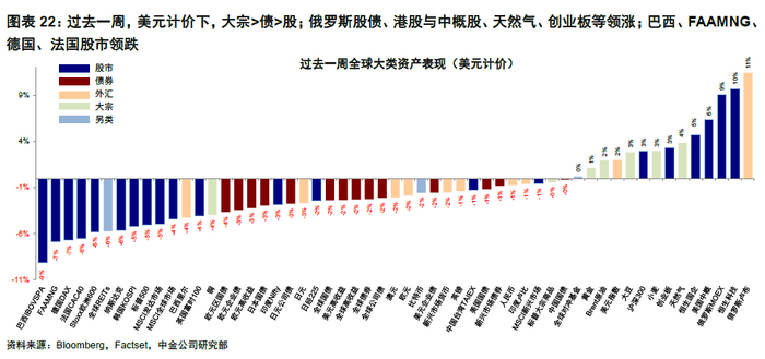 整体看,美元计价下,大宗>股>债;俄罗斯股汇、港股与中概股、天然气、创业板领涨;巴西、FAAMNG、德国、法国股市领跌。板块方面,标普500指数中板块普跌,银行、半导体、零售领跌。