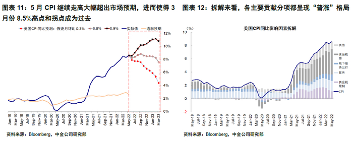 本周五公布的5月美国CPI大超预期,(同比8.6%,vs. 4月的8.3%及预期的8.2%),不仅没能继续回落而且各个分项普遍都超出预期。此次数据不仅改变了原有的路径,也延后了后续通胀回落的时间和速度。尽管基准情形下未来通胀逐步回落依然是大概率事件,但在当前腾挪空间不足的情况下,政策需要加码紧缩的概率也在进一步加大。