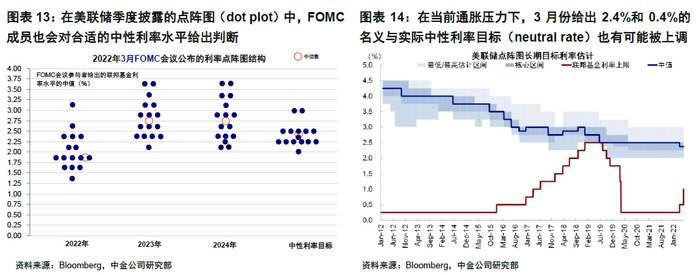 谈到这里,我们有必要理解中性利率或自然利率的概念。对于美联储而言,中性利率是在充分就业和稳定通胀情况下的短期利率,即货币政策既不收缩也不扩张的利率。在美联储季度披露的点阵图(dot plot)中,除对未来会议加息或降息的前瞻式指引外,FOMC成员也会对合适的中性利率水平给出判断。3月FOMC更新的预期中,美联储各成员给出的中性利率中值目标为2.4%。那么在当前通胀压力的背景下,美联储也需要尽快完成提升至超过中性利率的“目标”,因为只有将基准利率(融资成本)抬高至中性利率之上一段距离(投资回报率)才能实现抑制需求和控制通胀的目的,而这一差距越高则意味着金融条件越紧、对增长抑制的效果也就越大。