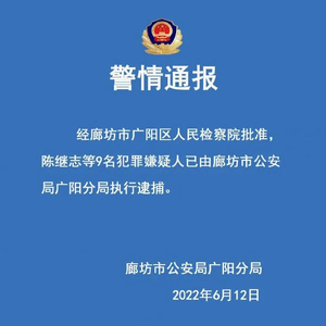 6月12日,廊坊市公安局广阳分局发布通报,经廊坊市广阳区人民检察院批准,陈继志等9名犯罪嫌疑人已由廊坊市公安局广阳分局执行逮捕。