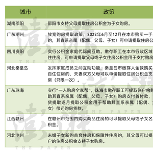 据澎湃新闻不完全统计,仅5月以来,至少包括湖南邵阳、广东潮州、四川资阳、河北秦皇岛、广东珠海、江西赣州、河北沧州、安徽池州、云南楚雄等9城发布公积金贷款新政,多地在政策中提到,实行公积金家庭代际间互助,实行“一人购房全家帮”。