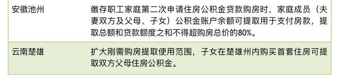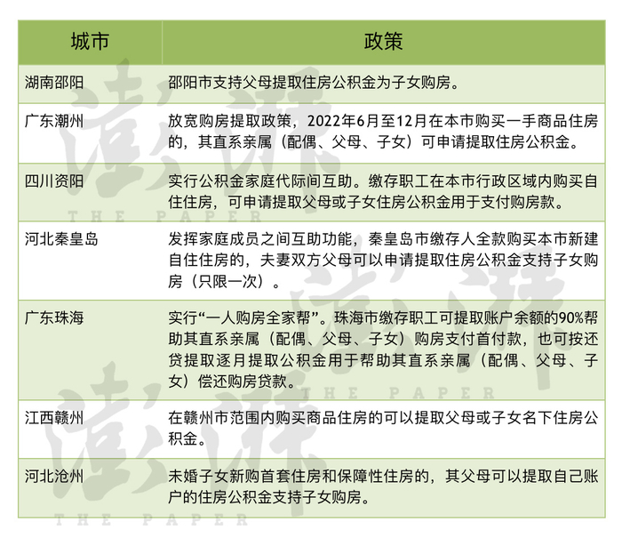 同日,四川省资阳市住房公积金管理中心发布的《<促进房地产市场平稳健康发展政策措施>的通知》中提到,实行公积金家庭代际间互助。缴存职工在本市行政区域内购买自住住房,可申请提取父母或子女住房公积金用于支付购房款;缴存职工与父母或子女在本市行政区域内共同购买自住住房,申请住房公积金贷款的,不受缴存职工占该共同购买房屋产权份额的限制。