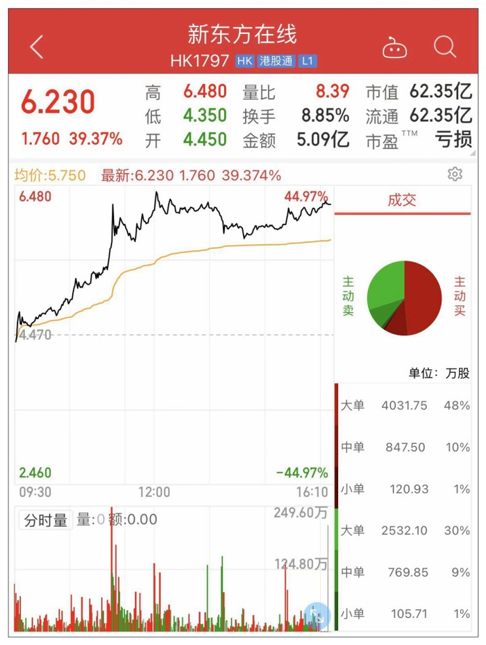 3天时间,粉丝增加近160万,销售额增加1777万元,虽然数据上涨速度远不如刘畊宏来得刺激(一周涨粉2686万),但凭借另辟蹊径的“双语带货”,短时间内,新东方旗下东方甄选直播间在网上制造了刷屏效应。爆炸式增长的直播间观看量以及涨粉速度,也刺激着新东方在线的股价飙升,6月10日盘中一度涨近40%。
