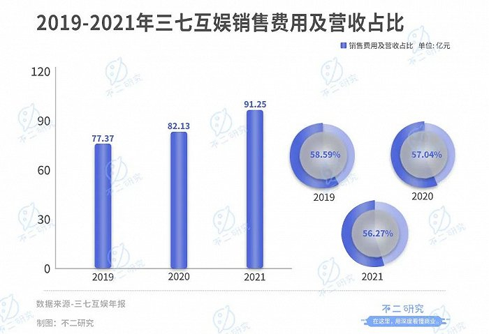 以三七互娱为例。根据年报,三七互娱2019年~2021年销售费用为77.37亿元、82.13亿元和91.25亿元,分别占当期营收的58.59%、57.04%和56.27%,复合年增长率达到47.88%。