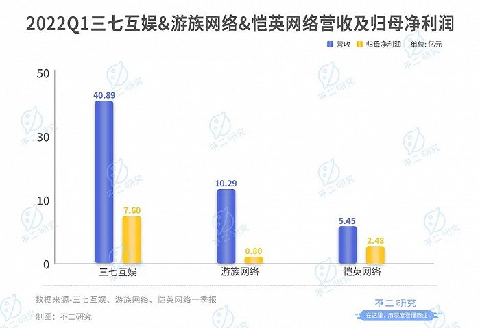 根据2022年一季报,三七互娱与恺英网络已实现营收的正增长:三七互娱营收约40.89亿元,同比增长7.11%;恺英网络实现营业收入10.29亿元,同比增长129.73%。游族网络则仍陷增长瓶颈,营收5.45亿元,同比减少42.31%。