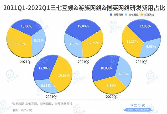 季报数据显示,2021年Q1~2022年Q1,游族网络研发费用占总收入比重分别为10.06%、15.80%、12.85%、12.90%和10.83%;三七互娱研发费用占总收入比重分别为8.51%、9.38%、6.96%、6.31%和6.75%;恺英网络研发费用分别为17.78%、12.59%、11.33%、16.69%和8.16%。三家公司研发费用占比均呈现下降趋势,研发费用对业绩的压力得到释放。