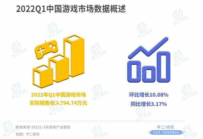 根据伽马数据《2022年1-3月游戏产业报告》,2022年一季度中国游戏市场实际销售收入794.74亿元,环比增长10.08%,同比增长3.17%,增速低于去年同期。
