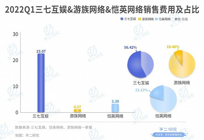 2022年一季度,三七互娱销售费用为23.07亿元,占总收入比重56.42%,仍维持较高占比;恺英网络和游族网络的销售费用占比则较为合理,分别为2.38亿和0.57亿元,占总收入比重为23.13%和10.46%。