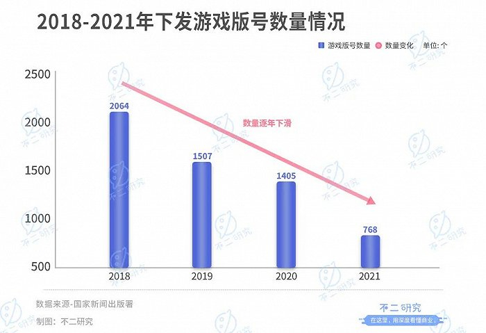 此番恢复版号也并不意味着形势的扭转。根据国家新闻出版署,2018年~2021年,下发的游戏版号分别为2064个、1507个、1405个和768个,数量逐年下滑。今年版号重启后首批45个游戏版号,比2021年月均64个减少近30%。此外,此次拿到版号的游戏公司多是中小厂商,腾讯、网易等国内游戏巨头并不在名单之列。