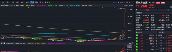 就在今天,这位“中国合伙人”又回来了,俞敏洪旗下在港股上市的企业新东方在线(01797.HK)盘中一度涨幅超过100%,成为全市场关注的焦点。而在上周五,新东方在线已经大涨了近40%,也就是说两个交易日累计涨幅超过100%。