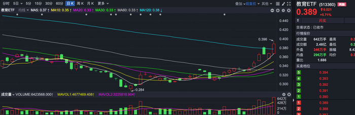 当时,豆神教育、中公教育等一大批教育股集体大涨,教育ETF也涨了3.89%。而今天,刚好又是中考第一天,教育ETF再次大涨5.71%,盘中最大涨幅高7.6%,短短一周时间,累计最大涨幅高达14.12%。而且今天,豆神教育再次20CM涨停,中公教育、昂立教育等个股都在大涨。