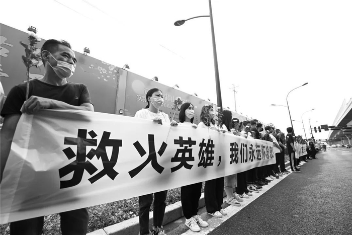 参加仪式的群众纷纷表示,消防员是和平时期最可爱的逆行者,他们救民于水火、助民于危难的精神值得我们景仰,向消防英雄致敬,希望他们每一次出警都能平安归来。现场指战员纷纷表态,崇高的荣誉是党和人民给予英雄至高无上的褒扬,两位烈士的先进事迹将激励我们化悲痛为力量,忠诚践行“对党忠诚、纪律严明、赴汤蹈火、竭诚为民”的授旗训词精神,坚决完成新时代消防救援队伍的光荣使命!