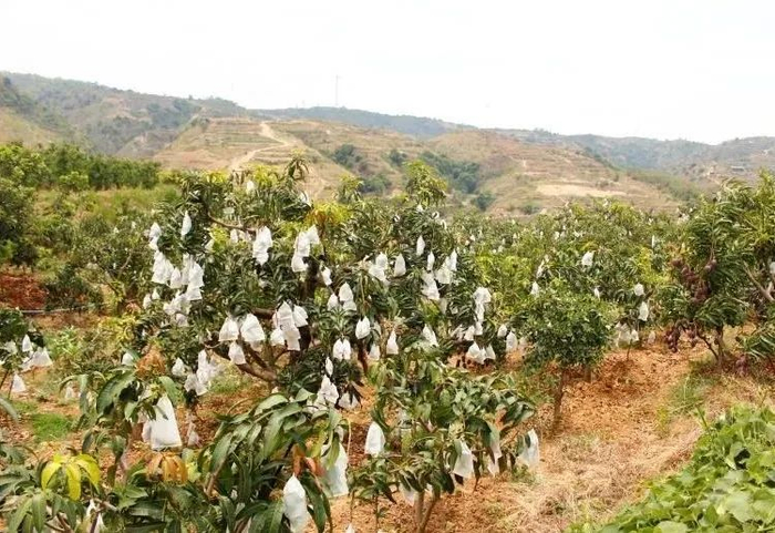 彩虹芒产季一到,芒果园为了防虫防病,早在芒果结实之初,便一一套袋,保证果子的完好生长。
