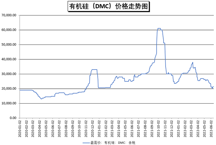 二季度以来,国内有机硅市场价格一路走低,六月初DMC市场价格一度跌至2万元/吨,不足去年高点时的1/3。