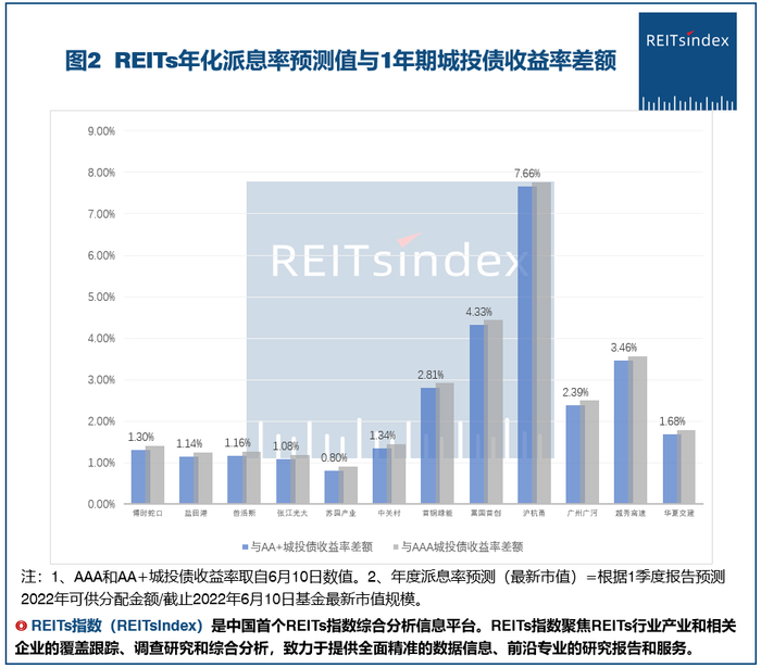 从图2可见,12只公募REITs的年化派息率预测值都高于1年期城投债(AAA和AA+)的收益率,与AAA城投债收益率差额区间为0.91%-7.77%,与AA+城投债收益率差额区间为0.80%-7.66%.。相比上周收益率差额都有所收缩。
