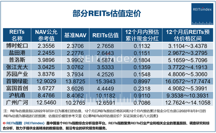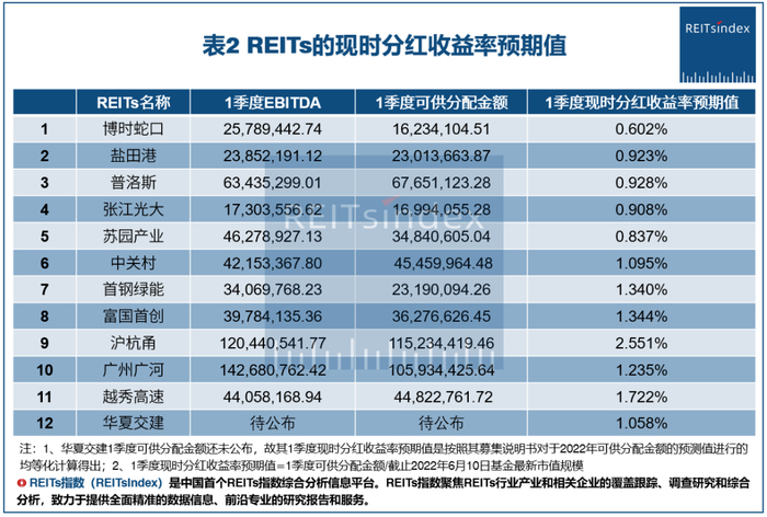 根据已公布的各只REITs基金的2022年第一季度报告的情况,我们可得出其现时分红收益率预期值,具体数值如下所示: