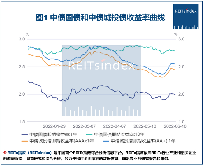 我们选取从2022年1月初到6月10日期间的中债1年期和10年期国债收益率曲线,中债1年期城投债(AAA和AA+评级)收益率曲线作为近期“市场无风险利率”的参考曲线,如下图所示: