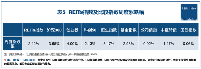 由上图表可见,REITs指数上周的周度涨跌幅为2.42%,结束了连续三周的小幅下跌,且上涨幅度明显。其他七个比较指数上周也都是上涨,涨幅最大的是创业板指数。上周REITs指数的涨幅弱于大部分股票指数,但好于债券指数,表明市场对于REITs基金的现金分红收益率的吸引力形成了共识,基本认为价格底部已形成,短期赚钱效已显现,且上周成交总金额继续放量,市场交投活跃度持续上涨。