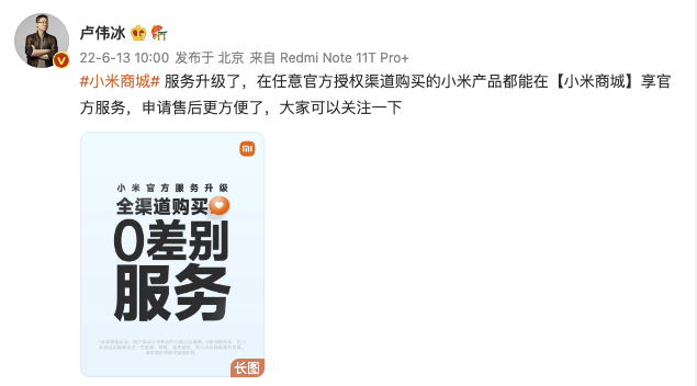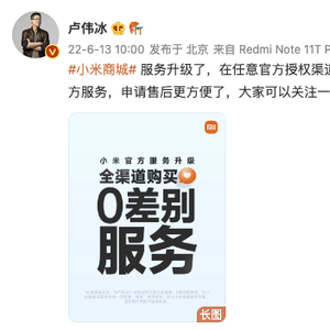 小米商城宣布服务升级:任意官方授权渠道购买的产品都能享官方服务 界面新闻 界面新闻官方账号 2022.06.1310:35 关注 6月13日,小米集团合伙人,中国区、国际部总裁卢伟冰宣布,小米商城服务升级,在任意官方授权渠道购买的小米产品都能在小米商城享官方服务。