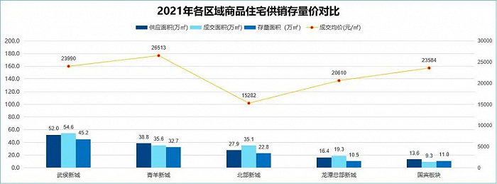 从住宅市场来看,2021年武侯新城供应52万㎡,成交达54.6万㎡。对比其他区同类区域板块,整体供需规模位居第一,成交均价为23990元/㎡,存量为45.2万㎡,去化周期约10个月,处于存量低值区间。