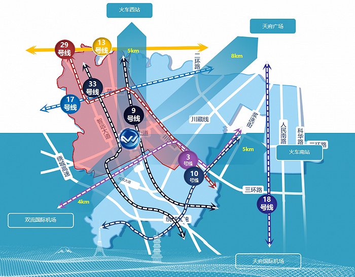 3宗土地周边1公里范围内,有地铁9号线、17号线两条地铁线路,可快速通达全城;片区内小、初、高全龄教育资源富集,地块1.5公里范围内有北二外(西区)中小学,川大附中、附小等学校;在商业配套上,2公里范围内,龙湖金楠天街、吾悦广场两大商业综合体均已建成开业,可满足各年龄阶层不同消费需求。