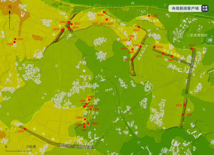 2020年至2022年,祭祀区共计开展发掘面积1834平方米,基本确认了祭祀区大致呈西北—东南走向的长方形分布范围,与北侧紧邻的三星堆城墙平行,面积将近13000平方米。