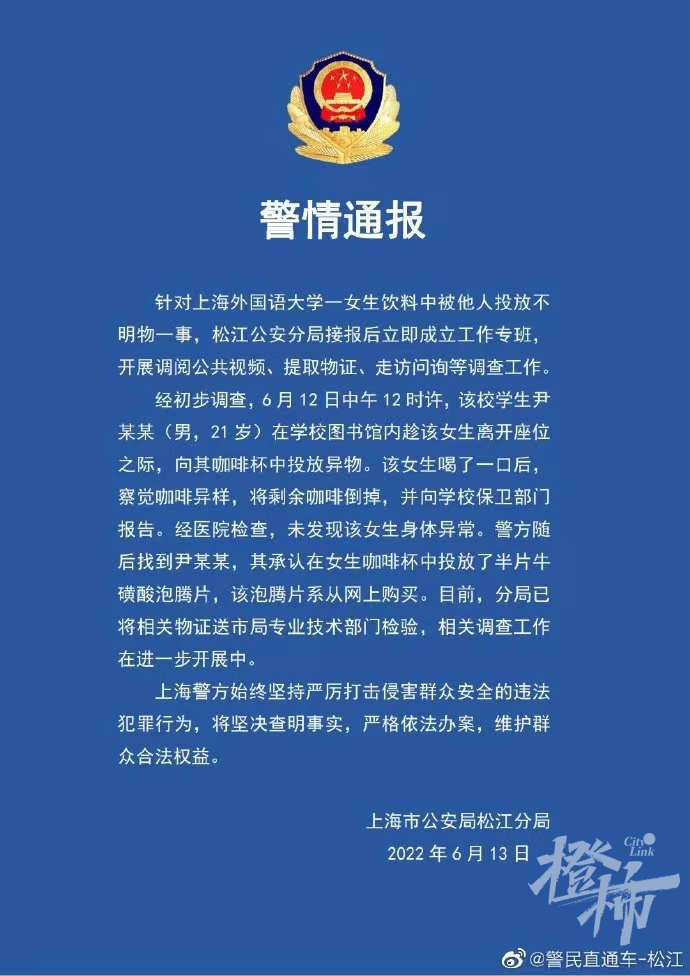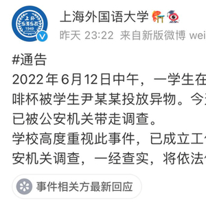 橙柿互动讯 昨天(6月12日)晚上,上海外国语大学发布通告称,当天中午该校一学生在图书馆向另一名学生的咖啡杯投放异物。目前,涉事学生已被公安机关带走调查。