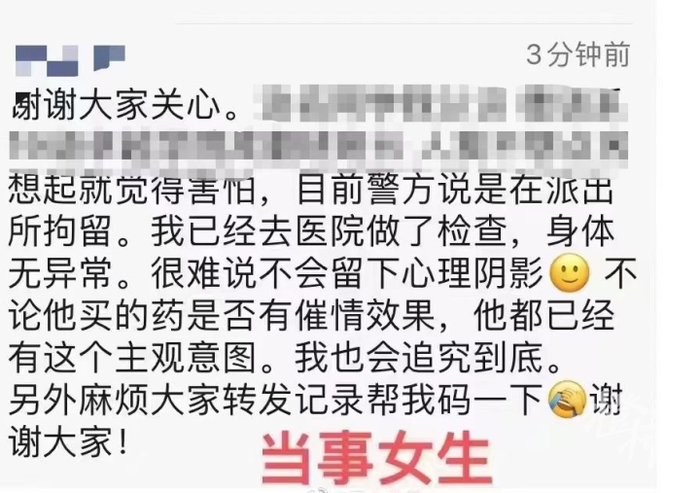 被投异物的女生聊天记录中说:“不论他买的药是否有催情效果,他都已经有这个主观意图。”