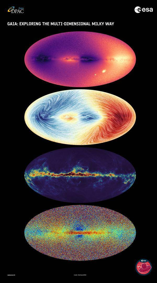 在当天,欧洲宇航局还公布了利用盖亚望远镜DR3绘制的天象图片,从多个维度展现了令人赞叹惊讶的银河系全景。