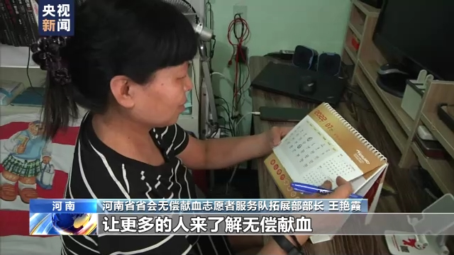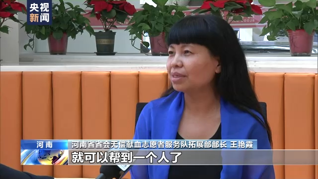 河南省省会无偿献血志愿者服务队拓展部部长 王艳霞:听护士说你献的血可以帮到一个人了,那时候觉得挺高兴的。后来听工作人员说有一个机采成分血,14天可以献一次,一年最多24次。我就想着我也献血小板。