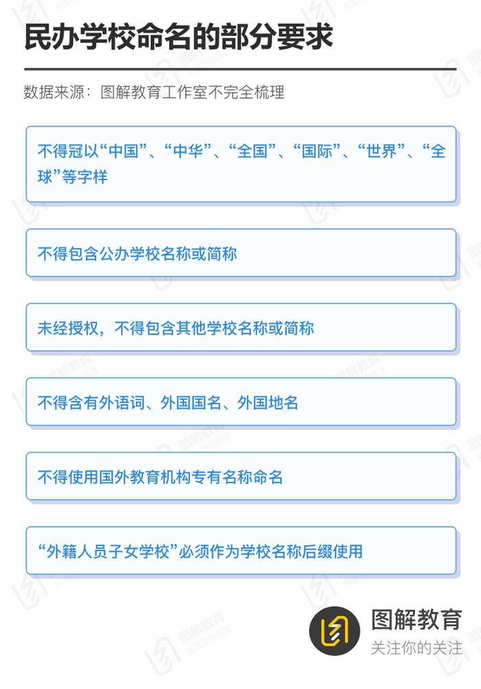 更名自非心血来潮,乃因政策要求。2015年《教育部关于做好外籍人员子女学校有关工作的意见》,2020年《关于规范民办义务教育发展的实施意见》,2021年《关于规范民办义务教育发展的意见》、《关于规范公办学校举办或者参与举办民办义务教育学校的通知》等,都对民办学校的命名有详细要求,概况起来主要有: