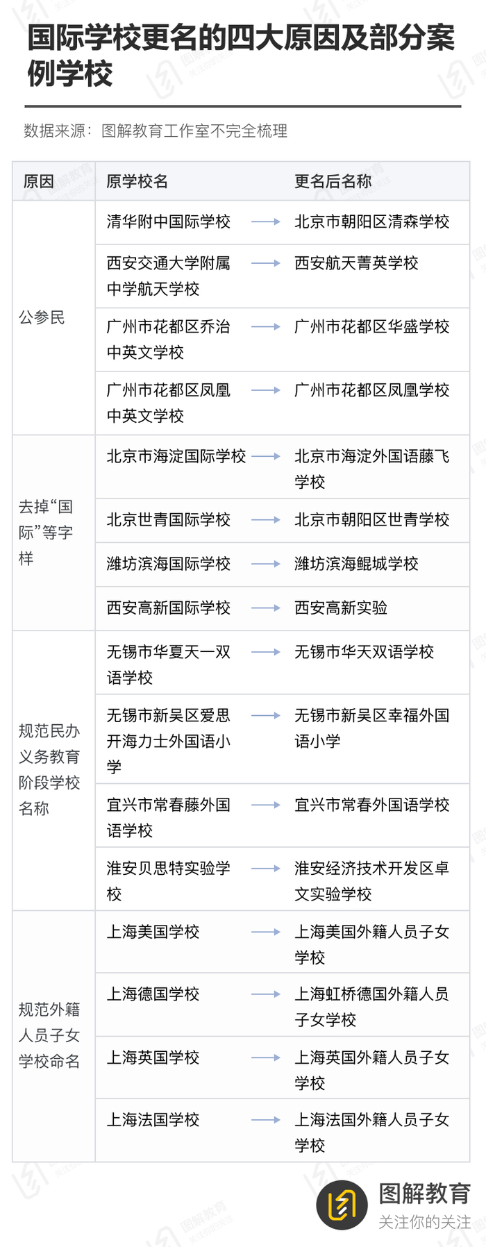 清华附中国际学校更名为北京市朝阳区清森学校、北京市海淀国际学校更名为北京市海淀外国语藤飞学校、哈罗北京更名为北京市朝阳区礼德学校、北京市力迈中美学校更名为北京市朝阳区力迈学校、北京市朝阳区北外附校双语学校更名为北京市朝阳区北外同文外国语学校、北京世青国际学校更名为北京市朝阳区世青学校、北京市私立新亚中学更名为北京市朝阳区正源新亚学校、北京市朝阳区青苗国际双语学校更名为北京市朝阳区青苗学校、北京市朝阳区启明星双语学校更名为北京市朝阳区启明星学校……