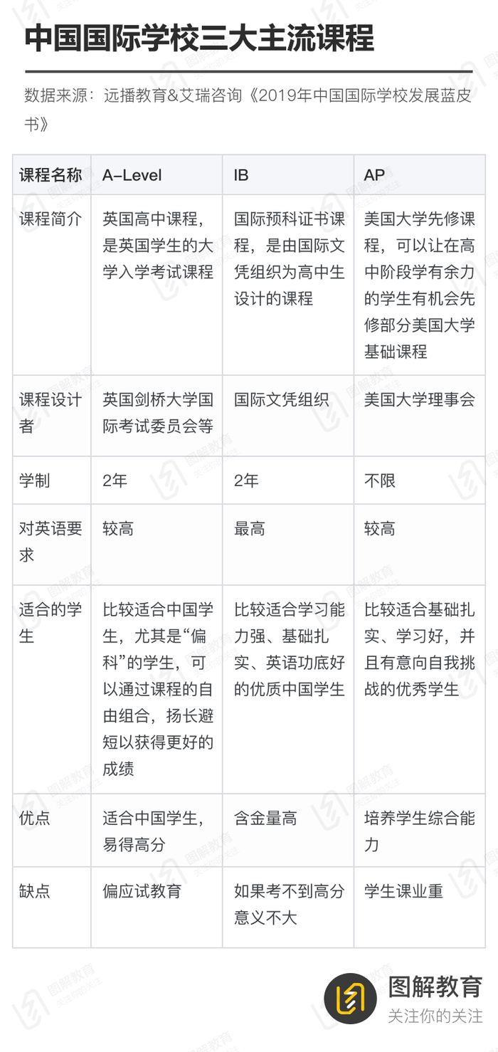 这三类国际学校中,前一种只允许外籍人员就读,后两种则对中国家庭开放,而A-Level(General Certificate of Education Advanced Level)、IB(International Baccalaureate) 、AP(Advanced Placement)是其三大主流课程。