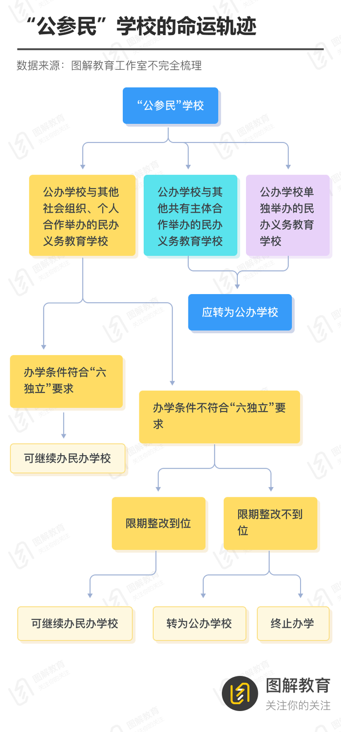 “公参民”学校主要有三类:(1)公办学校单独举办的民办义务教育学校,(2)公办学校与其他公有主体合作举办的民办义务教育学校,(3)公办学校与其他社会组织、个人合作举办的民办义务教育学校,其未来命运轨迹如下图所示: